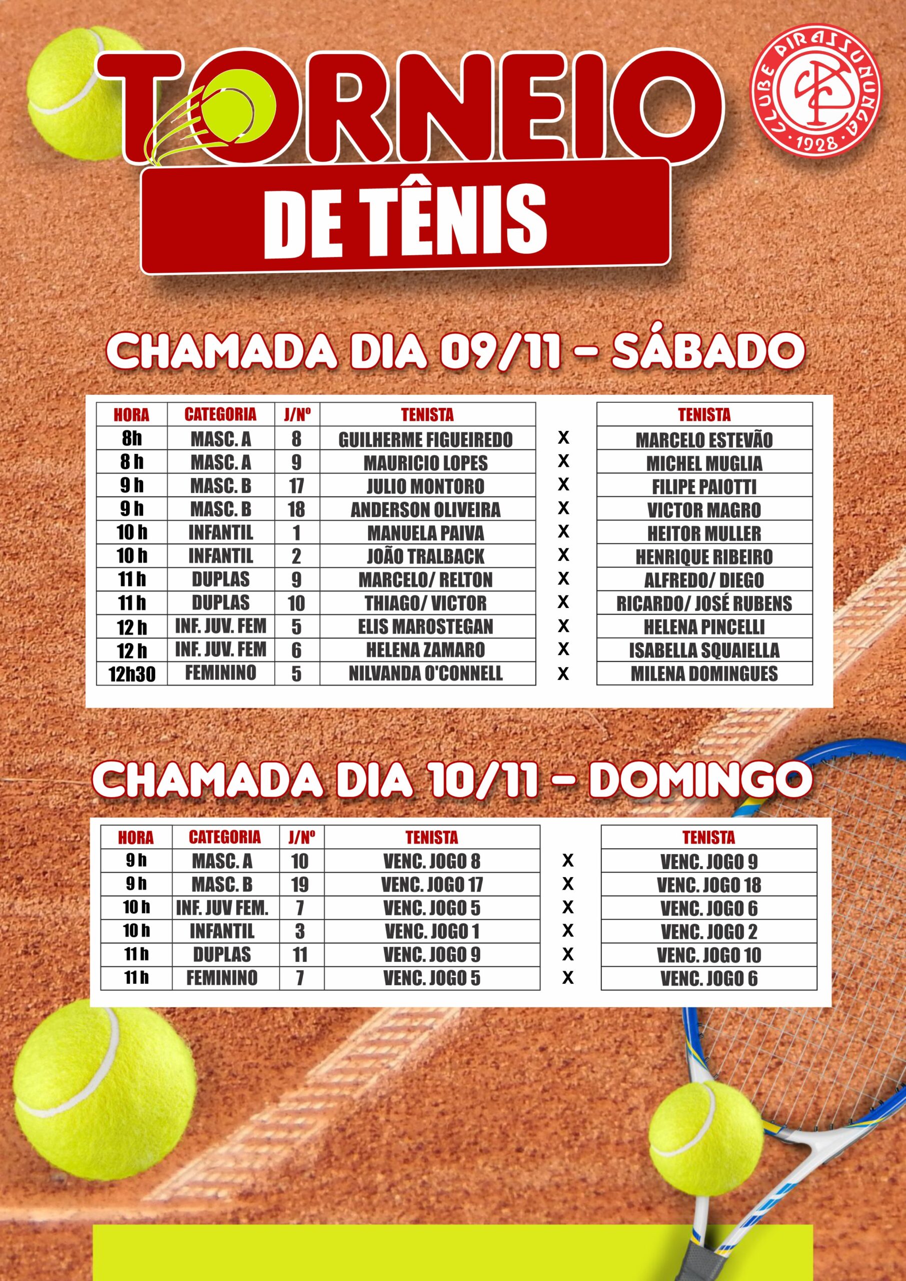 Nos dias 09 e 10 de novembro, teremos mais jogos imperdíveis do Torneio de Tênis do Clube Pirassununga, e você, associado, está convidado a fazer parte dessa torcida animada! 🏆 Cada partida traz a gente mais perto das finais, então venha torcer pelos nossos tenistas e curtir toda a adrenalina da competição ao vivo! 👏
