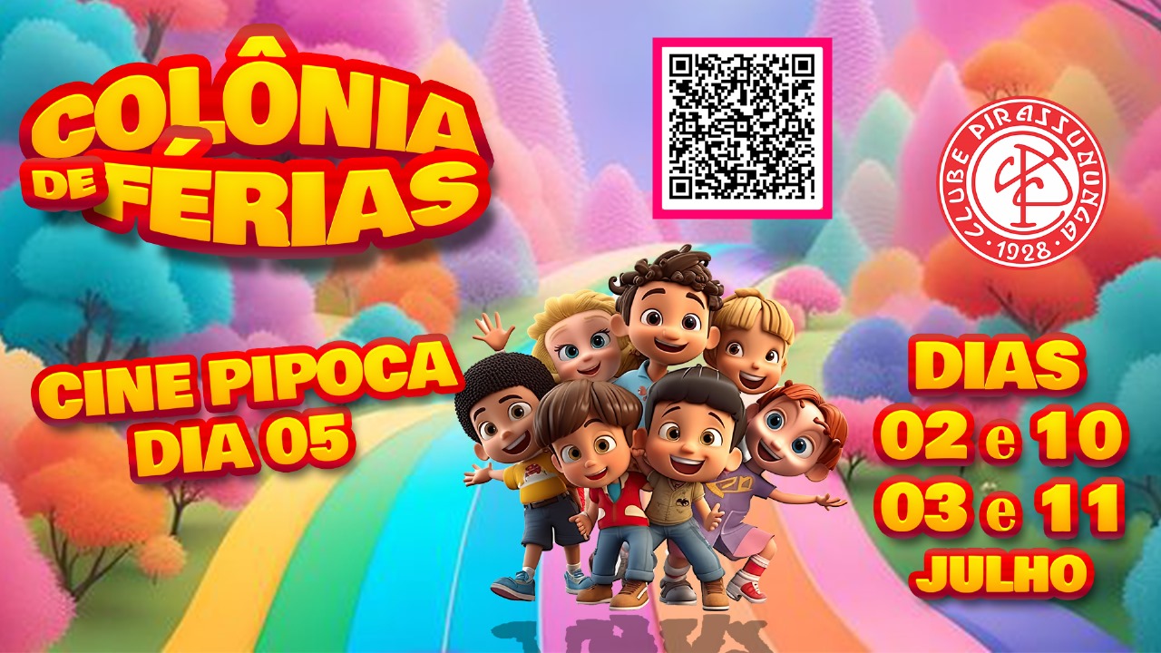 🎉🏖️ vem aí a Colônia de Férias no Clube Pirassununga! Nos dias 02, 03, 10 e 11 de julho, teremos muitas brincadeiras e jogos na Quadra de Esportes do Clube para animar a criançada! 🤸‍♂️⚽️