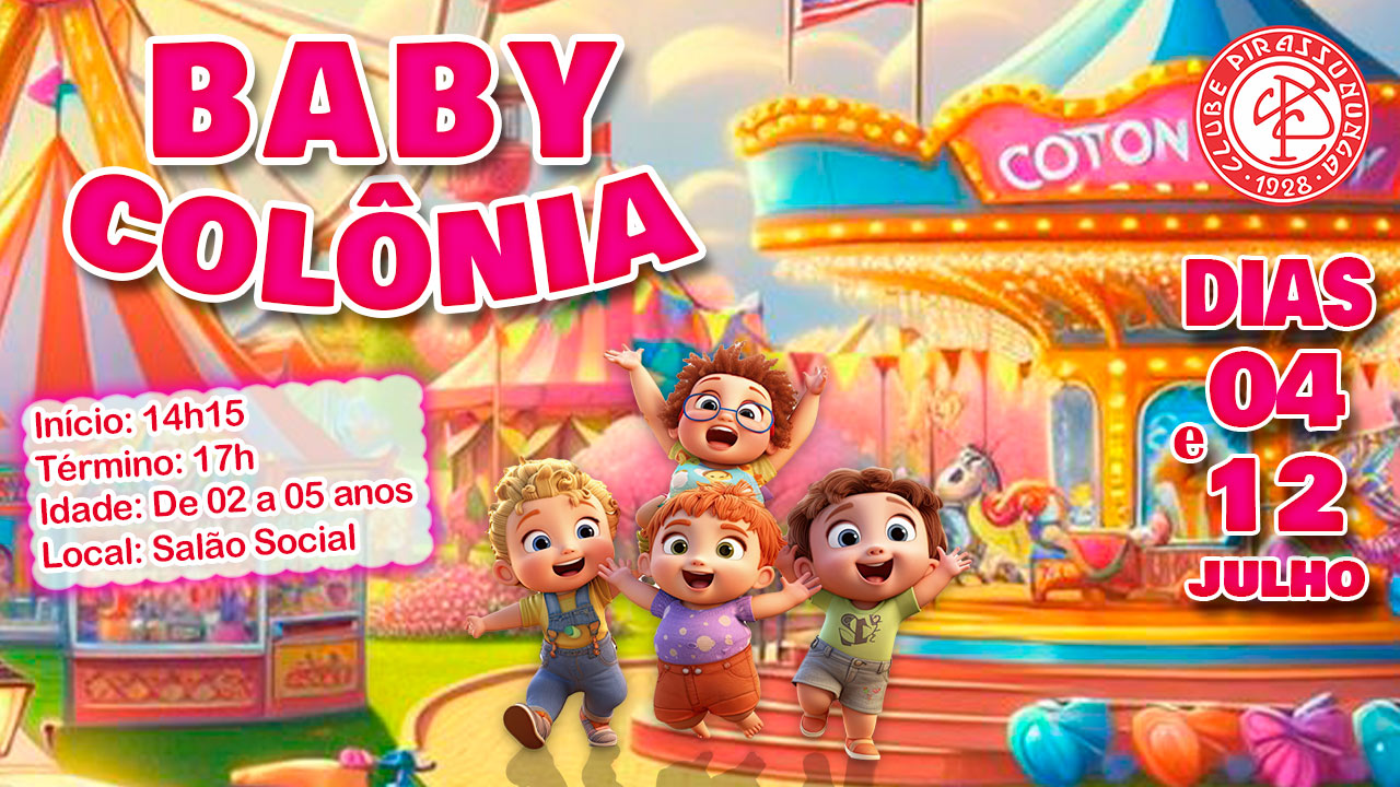 🎉✨ Vem aí, a festa mais esperada dos nossos baby associados, Clube Pirassununga: Baby Colônia nos dias 04 e 12 de julho para as crianças de 02 a 05 anos! 🎈🎊